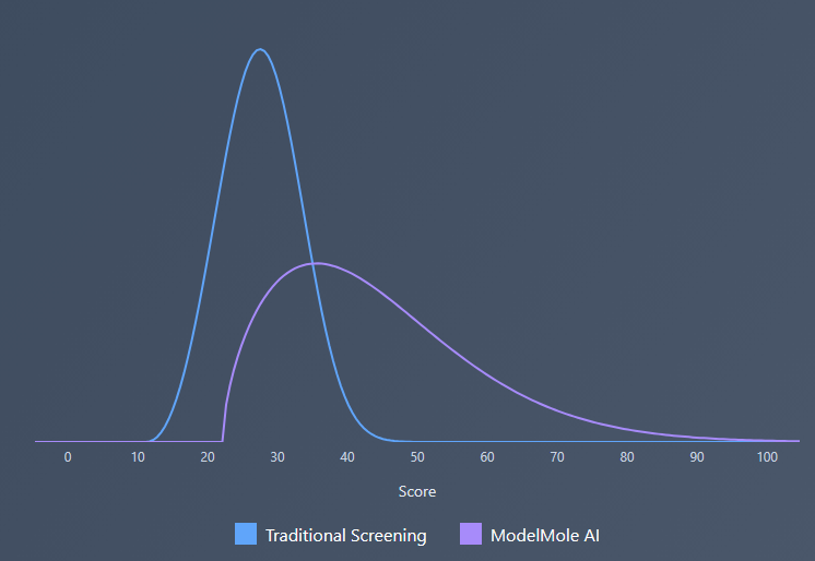Traditional computational screening methods yielded zero viable candidates (blue line), while ModelMole's AI approach dramatically increases the probability of discovering high-quality hits (purple line).
